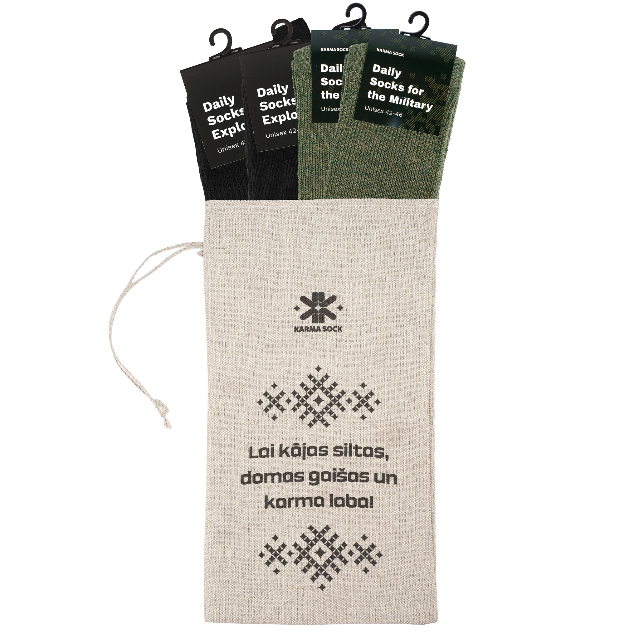 KarmaSock dāvanu komplekts aktīvajiem – ideāla izvēle cilvēkiem, kuri pavada laiku pie dabas un dzīvo kustībā. Komplektā iekļauti divi pāri militāro trekinga zeķu un divi pāri Daily Socks For Explorers – kopā četras augstas veiktspējas merino vilnas zeķes.