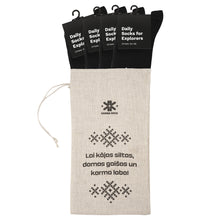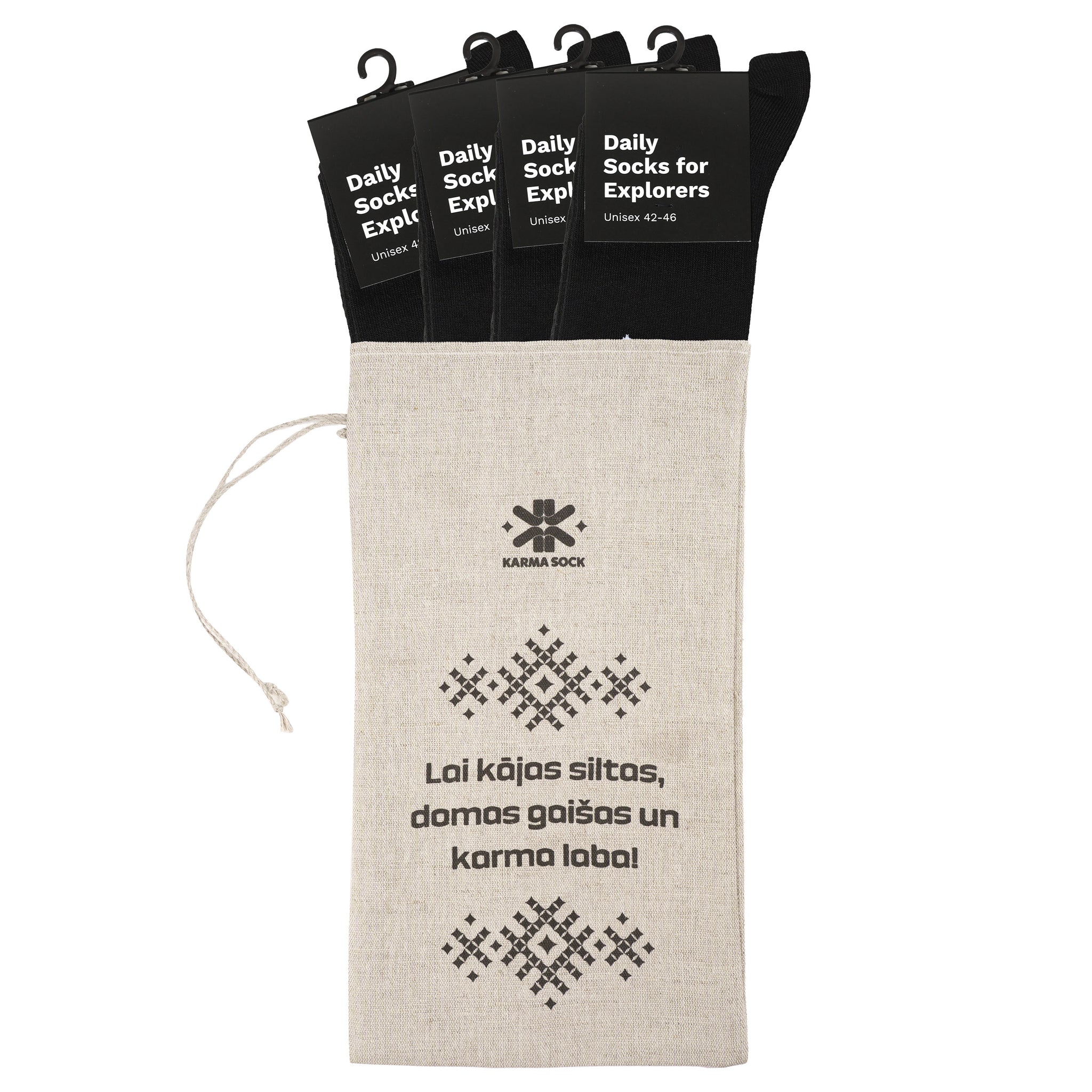 Šis ir 4 (četru) zeķu dāvanu komplekts iesaiņots elegantā, daudzreiz lietojamā lina dāvanu maisiņā ar svētku novēlējumu.