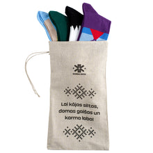 Zeķes elegantā lina dāvanu maisā ar vēlējumu.